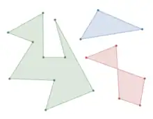 A simple polygon is a closed curve in the Euclidean plane consisting of straight line segments, meeting end-to-end to form a polygonal chain.[1] Two line segments meet at every endpoint, and there are no other points of intersection between the line segments. No proper subset of the line segments has the same properties.[2] The qualifier simple is sometimes omitted, with the word polygon assumed to mean a simple polygon.[3]