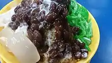 - Ice kacang, a mound of grated ice on a base consisting of jelly, red beans, corn and attap seeds, topped with various kinds of coloured sugar syrups, palm sugar, rose syrup and evaporated milk.