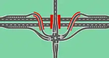 A single-point urban interchange (SPUI, /ˈspi/ SPOO-ee or /ˈspjuːi/ SPEW-ee), also called a single-point interchange (SPI)[1] or single-point diamond interchange (SPDI), is a type of highway interchange. The design was created in order to help move large volumes of traffic through limited amounts of space safely and efficiently.