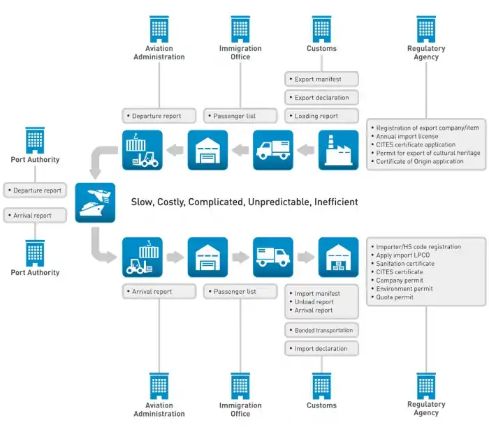 There are many actors and procedures required for international trade which may result in high costs and long waits. The reason why international trade needs practical support relatively more than domestic trade is the need for the inevitable controls of cross border regulatory Agencies (CBRAs).