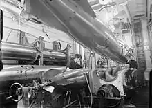 The torpedo room in the bows of HMS Rodney. The battleship was equipped with 24.5 inch torpedoes, the most heavy torpedo in British inventory. One torpedo is being loaded into a tube, whilst another is being lowered into its craddle. Rodney fired a total of 10 torpedoes at Bismarck.