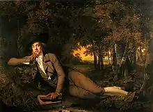 Boothby later visited Rousseau in Paris and promised him that he would publish his Confessions, an autobiographical work to which Boothby gave the title Dialogues ou Rousseau, Juge de Jean-Jacques. The book was published in Lichfield by Boothby in the French language. This achievement is immortalised in Joseph Wright of Derby's painting. The portrait shows Boothby reclining by a stream in a wooded glade once known as the Twenty Oaks where he and Rousseau met for discussion and where Rousseau went to write in peace and solitude. He is holding a leather bound book with the name Rousseau on the spine rather than a specific title, thus referencing Boothby's interest in the philosopher's entire oeuvre. The landscape setting can be interpreted as referring to the Rousseauian idea that all of man's troubles and unhappiness derive from his self-removal from the natural world. According to Andrew Graciano, the plants in the setting refer to Boothby's interest in botany and the botanical aspect of the painting has previously been ignored.[10] Both Boothby and Rousseau were interested in botany and Rousseau studied local flora when he lived at Wootton Hall.