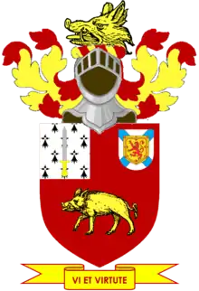 Arms of Saughton Hall: Gules a Sanglier passant Or on a Canton Ermine a Sword paleways proper; Crest: A Boar's Head erased Or: Motto: Vi et virtute (By strength and valour)