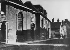 The oldest known photograph of the Mathematical School. Free School Lane is in the distance. Taken c 1880.