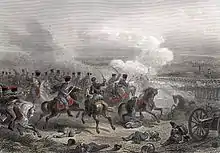Fletcher was again mentioned in dispatches when serving as chief engineer at the second siege of Badajoz (19 May – 10 June 1811).[3] The engineers suffered many casualties in their attempts to dig the thin rocky soils around a fort that had been repaired and reinforced since the last unsuccessful siege. Running short of ammunition and having sustained heavy losses; and with news that French reinforcements were on the way, Wellington withdrew his forces to Elvas on 10 June.[11] Fletcher was also present when Ciudad Rodrigo (7 – 19 January 1812) and, on the third attempt, Badajoz (17 March – 16 April 1812) were captured.[3] In the latter engagement it was Fletcher who identified the weak point in the defences and so ultimately decided where the main attack should be.[12] On 19 March, Fletcher was shot in the groin when a French sortie in the fog reached the trenches where he and his engineers were working. His injury might have been much worse if it had not been for a Spanish Silver Dollar in his pocket which took the main force of the musket ball. Fletcher's injury had him confined to his tent where Wellington, desperately short of good engineers, visited him daily for advice.[12][3] Fletcher returned to England to recover, and was made a baronet on 14 December 1812,[13] and awarded a pension of £1.00 per diem.[3] He received the Portuguese award of the Order of the Tower and Sword;[3] and the Army Gold Cross for Talavera, Bussaco, Ciudad Rodrigo, and Badajoz.[14]