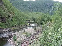 The Sjønstå River is the main river of the Sulitjelma drainage system. The stretch from its source at Langvatnet (Long Lake) to the village of Sjønstå, where it empties into Øvervatnet (Upper Lake) has been developed into the Sjønstå Hydroelectric Power Station. The river has many small tributaries.[3] Norwegian County Road 830 runs parallel to the Sjønstå River. The Sulitjelma Line formerly ran along the river. The drainage system is regulated by many hydroelectric stations. The river is 12.7 kilometers (7.9 mi) long and has a drainage basin of 779.45 square kilometers (300.95 sq mi).[4] The river's average discharge is 32.8 cubic meters per second (1,160 cu ft/s).[4]