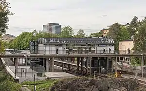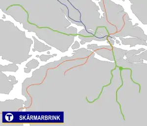 Skärmarbrink metro station is on the line 17 and 18 of the Stockholm metro, located in Skärmarbrink, Johanneshov, Söderort. The station, opened on 1 October 1950, then called Hammarby until 16 April 1958, was on the first metro line opened, from Slussen south to Hökarängen via Blåsut. On 16 April 1958, one-station extension to Hammarbyhöjden was opened.[2] Skärmarbrink is connected to Hammarbydepån, a depot/garage for buses and subway trains which is located south of the station.