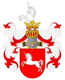 In the red field, the unicorn is white, to the right. At the top of the helmet there is a white unicorn coming out, to the right." The coat of arms is included in Part 1 of the Armorial of the Noble Families of the Kingdom of Poland, page 86.[4]