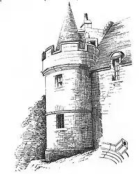The oldest portion of the present day castle was built in 1502 and added to in 1636, when corbelling and parapets were removed, whilst angle turrets, later roofed, were added.[3][21][22] Timothy Pont in his survey of Cunninghame around the year 1600 describes Skelmorlie Castle as "a fair well built house. It is certainly, in point of situation, a very pleasant and most delightful place, with its old-fashioned gardens, terrace and shrubbery. The view from it over the Firth of Clyde, to the opposite islands of Bute, Arran and Cumbraes, is not to be surpassed in picturesque scenery by any prospect in Britain".[3] The baronial hall was on the first floor and as a more modern day dining room it had the Montgomerie coat of arms on the roof with the date 1762. The castle chapel, converted in the 19th century to stables and servants' quarters, still stands at the western side of the southern courtyard.[23] Sir Robert's 17th range survives in part.[21]