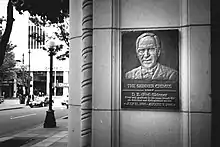 Named after industrialist David E. Skinner,[9] the eight-story Skinner Building exhibits a "restrained" Italian Renaissance revival design.[2][10][11] It is an E-shaped mixed-use building with offices on the upper floors and retail space on the ground floor and basement level.[12] The theatre entrance and box office are located at 1308 Fifth Avenue.[12][13] The main entrance to the Skinner Building is at 1326 Fifth Avenue, where there is a plaque dedicating the Skinner Chimes in memory of philanthropist David E. "Ned" Skinner II (1920–1988).[14] The chimes, which can be heard daily at noon in the downtown Seattle area, are actually an electronic carillon.[14]
