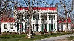 Shortly after, the bank sold it to Benjamin Harlan.[3] Harlan renamed it Oakwood Farm and turned it into a stock farm, importing stock from Spain and selling it in the south.[3] Harlan hired architect Nathan Vaught to redesign the mansion.[3] Vaught added "six white pillars and a grand veranda."[6] According to local historian Reid Smith, Harlan added his "own special trademark of hospitality" with "A little Negro slave boy [who], stationed in the shade of a mighty oak along the pike, stood ever ready with a drink of spring water for each and every passerby."[6]