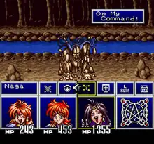 During the battle, seen from a first-person view, the player can tell each character in their party to do one of six things: attack with a weapon, cast of one of the character's magic spells (for magic users), use a special technique that varies from character to character, give up the character's turn for higher defense, attempt to flee from a random encounter battles, or use one of the items from the inventory.