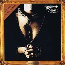 The album's front cover is a photo of a model with the snake wrapping around her shoulder eventually descending to her cleavage shot by Juren Barron Reisch, who also shot for the front cover of well-known pop/R&B artist Prince's 1979 eponymous album.[28] When asked about the story of the album's cover art, Coverdale stated that there were two models sent in to be photographed for the upcoming album, with a seventeen-year-old female model named Fransisca on the front cover who passed out caused by a movement from the "python that draped around her shoulders [...] between her substantial glow."[29] The original photo was cropped between the model's nose because "her eyes were rolling up" as a result of her fainting. For the back cover of the album, another unnamed model was brought in with the same situation that involved a snake's head around her neck with a similar dress that covered from her shoulder to the opposite hip.[30]