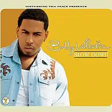 "Slow Down" is the debut single of American singer Bobby Valentino, released from his first self-titled album, Bobby Valentino, on February 14, 2005. Produced by Tim & Bob, the song spent four consecutive weeks at number one on the US Billboard Hot R&B/Hip-Hop Songs chart and has since been certified gold by the Recording Industry Association of America (RIAA). "Slow Down" also peaked at number eight on the Billboard Hot 100 as well as number four in the United Kingdom. The music video was directed by Erik White.[1]