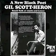 A New Black Poet - Small Talk at 125th and Lenox, also known simply as Small Talk at 125th and Lenox,[5] is a live album and the first release of recording artist Gil Scott-Heron, released in 1970 on Flying Dutchman Records.[6] Recording sessions for the album were originally said to have taken place live at a New York nightclub located on the corner of 125th Street and Lenox Avenue,[5] but liner notes included in the 2012 box set The Revolution Begins: The Flying Dutchman Masters, Scott-Heron himself insists that a small audience was brought to 'the studio' and seated on 'folding chairs'.[7] By the time of the recordings, Scott-Heron had published a volume of poetry and his first novel, The Vulture.[8] Well received by music critics who found Scott-Heron's material imaginative,[2][3] Small Talk at 125th and Lenox has been described as "a volcanic upheaval of intellectualism and social critique" by AllMusic editor John Bush.[1]