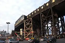 With an elevation of 87.5 feet (26.7 m) above ground level, Smith–Ninth Streets was the highest rapid transit station in the world when it was built.[31][32][33][lower-alpha 1] This elevation was required by now-defunct navigation regulations for tall-mast shipping on the Gowanus Canal, so the elevated structure rises over the entire structure of the Ninth Street Bridge, a vertical-lift bridge which carries its namesake street over the canal.[35] West (railroad north) of this station, the IND Culver Line curves north and enters a tunnel into Carroll Street station. This station and the next station south, Fourth Avenue, were the only original elevated stations built by the IND, with the remainder being underground.[36]