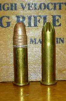 A regular Winchester .22 LR cartridge (left), with a star-crimped .22 Long Rifle snake shot cartridge loaded with No. 12 shot (right).