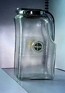 By 1918, the company's products (in addition to the lenses and lamps) were lantern globes, colored and crystal specialties, and food preservation ware such as canisters and fruit jars.[49] Around 1920, the company began making an interesting (but less important) product—a wall-mounted mail box. These mailboxes were made of glass, enabling one to easily see if mail had been delivered. Sneath employee William Chapman, working under the supervision of Ray Pruden, was granted a patent for the glass mailbox in 1921.[50][Note 7] Ray Pruden was superintendent of the factory, assuming that title after Henry Crimmel's stroke. William Chapman was a well-known glass blower who also secured a patent for an ash tray.[53] Employees of the company also patented other products, including a drawer pull,[54] a caster for furniture,[55] a newspaper receptacle,[56] and a chick feeding fount.[57] Years later, the glass mailbox was shown in Popular Mechanics magazine.[58]
