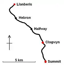 Hebron53°06′17″N 4°07′04″W / 53.1046°N 4.1179°W / 53.1046; -4.11791,069 ft (326 m)Named after the nearby 'Hebron' Chapel. It had originally been hoped that agricultural traffic could be carried to and from this station.