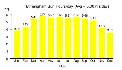 Alabama Power has installed four types of solar panels in Birmingham that can be monitored on the Internet.[5] The company will pay up to 4.81¢/kWh during the summer and 3.93¢/kWh in the winter for excess generation from up to 100 kW systems.[6] Peak power rates are weekdays, 1 to 7 pm in summer and 5 to 9 am in winter.[7] Customers choosing the Time Advantage Energy rate pay 7¢/kWh during winter peak periods and 25¢/kWh during summer peak periods. Off peak is charged 5¢/kWh. Using time advantage requires a time of use meter, and the base charge is increased by $10.50 each month.[8]