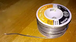 Electrical solder with an integrated rosin core, visible as a dark spot in the cut end of the solder wire.