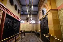 The interior of the monument is designed to serve as a memorial tablet room. It features marble tablets along the outer walls on which the names of the veterans from Cuyahoga County are engraved. The inner walls, which surround the base of the large granite shaft, feature four large bronze panels. The bronze panels include life-size depictions of allegorical scenes relating to the Civil War. Above the bronze panels on the inner walls are a series of medallions which depict notable military figures from throughout the Civil War. Above the memorial tablets on the outer walls sit a series of busts which depict notable individuals from Cuyahoga County who died as a result of their service.[1][3]