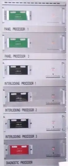 SSI utilises a 2-out-of-3 redundancy architecture, whereby all safety-critical functions are performed in three separate processing lanes and the results voted upon. An SSI interlocking cubicle comprises three Interlocking Processors or Multi Processor Modules (MPMs), two Panel Processors and a Diagnostics Processor (DMPM). An SSI system can operate on two MPMs in the event of the failure of one. It does not need the DMPM to function as an interlocking, as this drives the technician's terminal only.