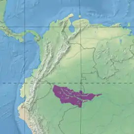 The Solimões-Japurá moist forests has an area of 16,757,223 hectares (41,408,000 acres) divided between Colombia, Brazil and Peru. The northern boundary of the western portion in Colombia is defined by the Caqueta River.[1] The Caqueta separates the ecoregion from the Caquetá moist forests to the north.[2] The Caqueta becomes the Japurá River when it crosses the border with Brazil, and the Japurá (or the Purus várzea along the Japurá) defines the northern boundary in Brazil to the point where the Japurá meets the Solimões River.[1] The Japurá-Solimões-Negro moist forests lies to the north of the Japurá.[2]