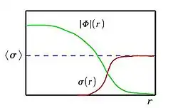 the NTS is a ball with radius R filled with the field . Here is a constant inside the ball except for a thin surface coat where it sharply drops to the global U(1) symmetrical minimum of . The value is adjusted so that it minimises the energy of the configuration