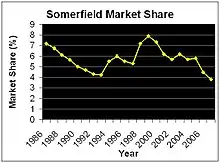 According to The Guardian newspaper, the holding company almost collapsed in the 1990s under a "mountain of debt".[11] In 1996, Somerfield plc was floated on the stock market in an initial public offering, after the recovery had reached the point where flotation became feasible with a market value of around £600m, and the proceeds were used to repay banks that had lent to Isosceles.[11] At the time of the flotation the company's market share had fallen to 5.3%, its lowest level for two years, but Simons claimed that the company was now clearly positioned in the market, and that the business would benefit from what he saw as the trend back towards high-street shopping. The aim was to become the UK's strongest neighbourhood food retailer.[10]