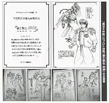Ship designs were given hand-like extremities as the team wanted to give them character; Yokoo stated that said designs also served as an experiment to determine if they could merge the ship's operability and personality together to avoid gameplay interference with their hitbox, while the samurai dragon Miyamoto was used as a test to determine reaction towards a humanoid "ship" from players.[6] The team also wanted to emphasize a sense of story, making the playable characters speak at the beginning and end of stages.[6] Gain, whose name derived from the character Gainshain in Shunji Enomoto's Golden Lucky manga, was designed with a tough and muscular look as the team thought of preferences from arcade players at the time, with Yokoo stating that adding his monkey companion gave him more character.[6] Chitta, whose name derived from the "Cinechitta" movie theatre at Kawasaki near Raizing's then-offices at Kamada, was intended to be a "moe" magical girl and the team made her perform stuff such as idol concerts, but Yokoo said that "it seemed it really didn't have the effect we were hoping for".[6] Bonum was named after bones and his name is a reference to the character Bornnam from the first part of Hirohiko Araki's JoJo's Bizarre Adventure.[6] Other characters were inspired by Wizardry.[6]