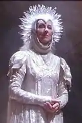 The Sorceress is clothed in long white robes, with feather-like strands of white fabric hanging from her arms as a homage to the original design, although they are only visible in the scene where she waves goodbye to the characters of Julie and Kevin. Rather than a bird-like headpiece, crystals are placed throughout the Sorceress' long, silver hair like a crown.