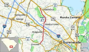 South Carolina Highway 27 (SC 27) is a 19.511-mile (31.400 km) primary state highway in the U.S. state of South Carolina. It serves to connect the town of Ridgeville with nearby highways.