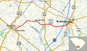 South Carolina Highway 63 (SC 63) is a 28.200-mile-long (45.384 km) state highway in the U.S. state of South Carolina. The highway is designated on a north–south direction, though it is signed as and located physically on an east–west orientation, from U.S. Route 278 (US 278) in Varnville to SC 64 Business (SC 64 Bus.) in Walterboro.[3]