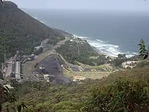 The line then heads south through the challenging terrain of the Royal National Park and Illawarra escarpment. The line makes a steep descent down to Wollongong. The original alignment through the towns of Helensburgh and Lilyvale which opened in 1888 was bypassed by a new route in 1915. A new station at Helensburgh was subsequently opened with the new alignment.[25] A set of points allows the turnback of trains at Helensburgh. The line then proceeds through several tunnels down the Illawarra escarpment through the hamlets of Otford, Stanwell Park and Coalcliff.