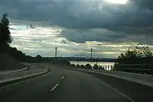 On the Mainland, Highway 17 is known as the South Fraser Perimeter Road (SFPR), a component of the British Columbia Ministry of Transportation's Gateway Program. It is a four-lane highway with a mix of freeway and expressway sections. The highway has a speed limit of 80 km/h (50 mph) over most of its length, connecting the Tsawwassen Ferry Terminal and Highway 99 in Delta to Highway 1 at 176th Street in Surrey, and providing access to all five of the major Fraser River crossings in Metro Vancouver.[5] The mainland section is notable for its extensive use of noise walls, split level construction through Delta and use in some urban sections of so-called Quiet Pavement to reduce traffic noise.[6]