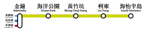 The South Island line (Chinese: 南港島綫), identified by light green on the MTR route map, is a rapid transit line of Hong Kong's MTR metro system. This line connects the HK business district from Admiralty station to the Southern District of Hong Kong Island and the island of Ap Lei Chau, which was not served by any rail transport prior to the opening of this line.[2] The rolling stock of South Island line is purpose-built for driverless operation. Trains are remotely controlled from the Operations Control Centre in Tsing Yi. Approved by the Executive Council in 2007,[3] the line commenced service on 28 December 2016.[4]