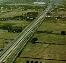 In the late 1970s, the expressway was extended by another 29 kilometers (18 mi) from Alabang up to Calamba, Laguna through the Manila South Expressway Extension project.[16][17][18] It included the 1.2-kilometer-long (0.75 mi) Alabang Viaduct in Alabang.