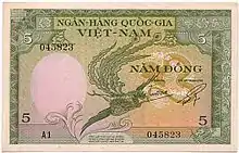 In 1953, notes (dated 1952) were introduced by the Institut d'Emission des Etats du Cambodge, du Laos et du Vietnam in denominations of 1, 5, 10, 100 and 200 đồng. On 22 September 1955, the Ministry of Finance and Economic Affairs announced that notes from the Bank of Indochina and the Institut d’Emission issues for Cambodia and Laos would be exchanged for Institut d’Emission issues for Vietnam starting 30 September until 7 November. The Institut issues for Cambodia and Laos ceased to be legal tender on 7 October, and all Bank of Indochina notes lost their legal tender status on 31 October following the 15 October introduction of the first notes from the National Bank of Vietnam.[3] Subsequently, the Ngân-Hàng Quốc-Gia Việt-Nam (National Bank of Vietnam) took over the issuance of paper money, introducing 2 and 500 đồng notes in 1955 and 20 and 50 đồng in 1956. Between 1964 and 1968, notes below 50 đồng were replaced by coins. In 1971, 1000 đồng notes were introduced. Due to steady inflation, 5000 and 10000 đồng notes were printed in 1975 but not issued due to the fall of Saigon.