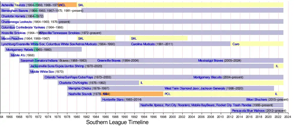 The Double-A SALLY League was reorganized as the Southern League in 1964. It elected to start with a clean slate and not maintain records prior to the 1964 season. The newly minted league wanted to distance itself from the SALLY League's past history in the low minors (Class C was roughly equivalent to an Advanced Rookie league today, while Class B was roughly equivalent to short-season Class A). Additionally, many leagues had contributed to its legacy.[3] In its inaugural campaign, the six-team Southern League consisted of the Asheville Tourists, Birmingham Barons, Charlotte Hornets, Chattanooga Lookouts, Columbus Confederate Yankees, Knoxville Smokies, Lynchburg White Sox, and Macon Peaches.[1] Sam C. Smith, previously president of the SALLY League, served as its president.[3]