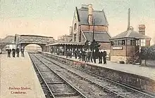 At Exeter, the LSWR had its own station, Queen Street, more conveniently situated than the St Davids station of the Bristol & Exeter Railway (B&ER), but its elevated location made onward extension into west Devon difficult. When it eventually did so, it descended by a steep and curved connection into the B&ER station, running a few miles northward on that line and then diverging to the west, to Crediton. The line onward led into several main line branches: to Barnstaple and Bideford (and later Ilfracombe); to Halwill and Holsworthy, with Halwill itself becoming a junction later; and to Plymouth, reached at first over part of the route of the rival broad gauge interest.[1][2][3]