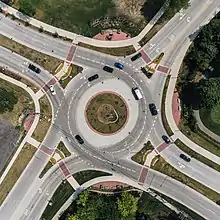 Two sculptures by local artists sit in the center of the two traffic roundabouts that are on Evergreen Road. Diversity, by John Piet, former art professor at Macomb Community College and 35-year resident of Southfield sits in the center of the northern Evergreen Road roundabout.[32] Gratitude, by nationally-acclaimed Southfield sculptor Jay Lefkowitz, sits in the southern Evergreen Road roundabout.[33][34]