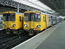 Southport railway station serves the town of Southport, Merseyside, England. The station is the terminal of the Southport branch of the Northern Line of the electric Merseyrail network and the diesel-operated Manchester-Southport Line. It is the fourth busiest station on the Merseyrail network. The station and services to Liverpool and Hunts Cross are operated by Merseyrail, with Manchester services operated by Northern Trains.