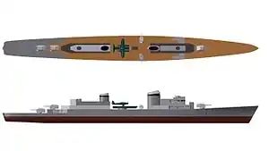 A design designated as 1939 introduced a seaplane carried in the midships area; the torpedo tubes were removed to facilitate this. The catapult was suggested to be mounted between the funnels of the design, however there never seemed to be line drawings, or blueprints that showed that.