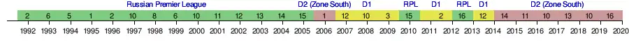 Season Div. Pos. Pl. W D L GS GA P Cup Europe Top Scorer (League) 1960 2nd, RSFSR-3 14 26 3 4 19 26 68 10 - - 1961 2nd, RSFSR-4 10 24 6 6 12 32 57 18 1/64 - 1962 2nd, RSFSR-3 8 28 10 6 12 38 36 26 1/128 - 1963 3rd, RSFSR-3 7 30 12 8 10 47 39 32 1/512 - 1964 3rd, RSFSR-4 4 34 16 7 11 53 35 39 1/512 - 3rd, RSFSR-final 4 8 3 2 3 9 10 8 1965 3rd, RSFSR-4 9 38 16 7 15 54 43 39 - - 1966 1 38 22 9 7 80 40 53 1/32 - 3rd, RSFSR-final 2 7 4 1 2 9 4 9 1967 2nd, group 1 16 38 10 11 17 34 45 31 1/32 - 1968 2nd, group 3 2 40 19 12 9 53 29 50 1/64 -