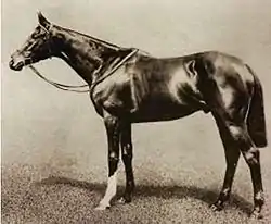 Spearmint was a bay horse with a white blaze and a white sock on his left foreleg who stood 16 hands high.[1] He was bred by Sir Tatton Sykes at the famous Sledmere Stud in Yorkshire. He was by the outstanding racehorse and sire Carbine, a New Zealand Racing Hall of Fame and Australian Racing Hall of Fame inductee to whom he was said to bear a striking resemblance.[2] His dam was the unraced mare Maid of the Mint, by Minting. The mating of Spearmint's parents had actually been arranged by the Maid of the Mint's owner, Sir James Duke, but an expensive lawsuit then forced him to sell the now pregnant mare to Sir Tatton Sykes.[3] Spearmint was doubly inbred to Stockwell in the 4th and 5th generations (4m x 4f x 5f).[4]
