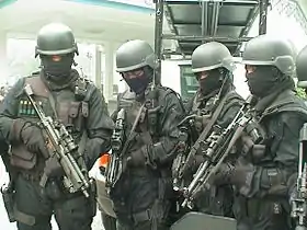 The tactics and organization of the UTK are primarily influenced by the German GSG-9, but with a difference; UTK operatives operate mostly in plain clothes and also perform undercover missions. With approximately 300 members, the UTK is deployed in cases of hostage taking, kidnapping, terrorism and extortion. The group may also be used to secure locations, neutralize targets, track down fugitives, escorting and protecting leaders and VIPs, and occasionally conduct sniper operations.[11][12] UTK members are trained to operate urban operations,[13] airborne operations, and underwater operations.