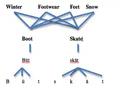In 1994,[25] Dell proposed a model of the lexical network that became fundamental in the understanding of the way speech is produced.[1] This model of the lexical network attempts to symbolically represent the lexicon, and in turn, explain how people choose the words they wish to produce, and how those words are to be organized into speech. Dell's model was composed of three stages, semantics, words, and phonemes. The words in the highest stage of the model represent the semantic category. (In the image, the words representing semantic category are winter, footwear, feet, and snow represent the semantic categories of boot and skate.) The second level represents the words that refer to the semantic category (In the image, boot and skate). And, the third level represents the phonemes ( syllabic information including onset, vowels, and codas).[26]
