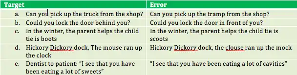Examples of speech errors. The target is what the speaker intended to say. The error is what the speaker actually said. These mistakes have been studied to learn about the structure of speech production.