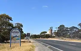 Entering Speed from the north via the Sunraysia Highway, 2018. Note the sign reads "Welcome to Speed. Please slow down"